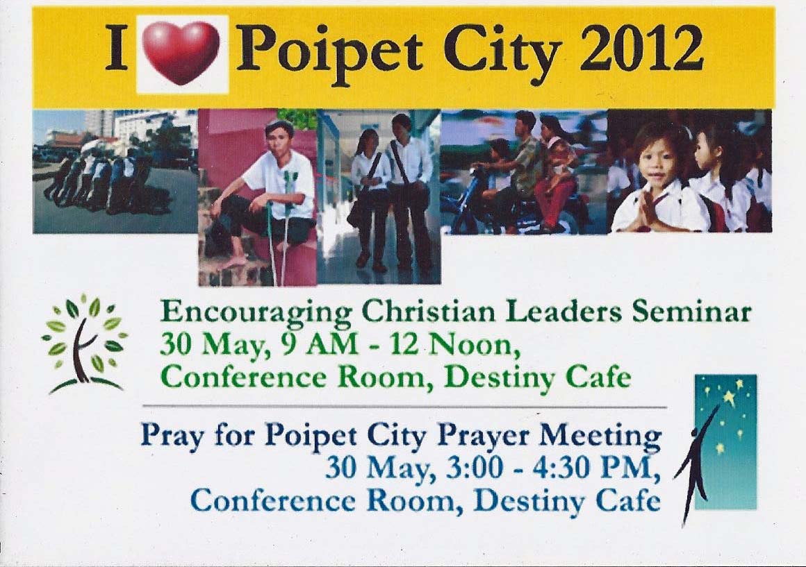 About twenty five Christian leaders came together on the 25th of April for an encouragement seminar and prayer meeting. This is the first of many meetings in a program called “I Love Poipet City”. The goal of this program is to strengthen the existing churches, and to be a launching point for new church plants here in Poipet.